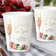 Strawberry and champagne paper cups, lettered with Cheers to Love in casually elegant gold calligraphy. Watercolor design with a glass of champagne, strawberries and strawberry flower. The template is ready for you to personalise for any occasion, such as bridal shower, couples shower, anniversary, engagement etc.