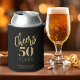 Modern gold typography script cheers to 50 years birthday party personalised black simple elegant can cooler. Personalise it with the name, date, and place or your text.