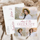 Invite guests to celebrate the graduate with our stylish photo graduation party invitation postcards! The modern graduation party postcards display 3 of the graduate's senior photos. The phrase "cheers to the graduate" is featured in trendy burgundy lettering. Personalise the front of the graduation invitation postcards by adding the graduate's name, school name, and graduation year. The invitation reverses to feature your return address and graduation party details.