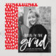 Stylish, modern graduation announcements featuring the graduate's vertical photo with "Cheers to the grad" in a white, hand-lettered brush script. Personalise the front of the announcement by adding the graduate's name, school name, and graduation year. The photo graduation announcement reverses to display a red and white abstract dot pattern.
