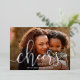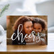 Bold and elegant New Year photo cards feature a horizontal or landscape orientated photo with "cheers to [year]" overlaid in silver foil calligraphy script lettering. Personalise with a message or family signature along the bottom.