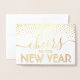 Cheers to the New Year! Send family and friends joyful holiday wishes with elegant real foil folded holiday cards. All wording on this template is simple to personalise. Colours and fonts are also easy to change with the Zazzle design tool. The front side of this card is printed with real metallic gold foil lettering and cascading confetti dots. The navy blue, white and gold design also features modern handwritten style script calligraphy, chic minimalist vintage typography, and a personalised message. Please note that interior is printed colour, not metallic foil. Family and friends will love displaying this elegant and stylish customised card. Happy New Year!