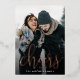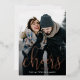 Bold and elegant New Year photo cards feature a vertical or portrait orientated photo with "cheers to [year]" overlaid in rose gold foil calligraphy script lettering. Personalise with a message or family signature along the bottom.