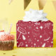 Red & White Christmas wrapping paper with toys, trees, and other holiday images.