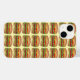 Phone case features an original illustration of a burger topped with cheese, tomato, and lettuce on a bun.
