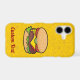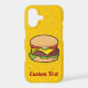 Cheeseburger cartoon illustration on yellow junk food seamless background. Custom text.