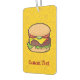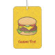 Cheeseburger cartoon illustration. Junk food outline icons yellow pattern background. Custom text on both sides.