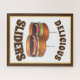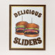 Design features an original marker illustration of a pair of cheeseburger sliders piled high with lettuce, tomato, onions, and pickles--a staple appetizer and popular bar and pub food favourite!