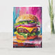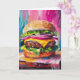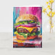A fun and playful modern art painting of a giant loaded cheeseburger. The artwork is brought to life with textured, abstract brushstrokes in vibrant colours like pink, blue, and yellow. The bold use of colour and exaggerated scale give the cheeseburger an energetic, whimsical feel. This lively, imaginative piece blends pop culture and abstract expressionism, making it a quirky and eye-catching addition to any space.