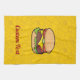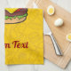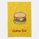 Cheeseburger cartoon illustration. Junk food outline icons yellow pattern background. Custom text.