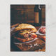 Cheeseburger with beef patty, wisconsin swiss cheese, ham, sauteed mushrooms, dijon mustard, mayonnaise and potato roll. Bottle of craft beer and raw patty on background.