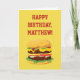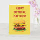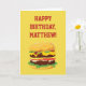 Give cheeseburger fans a personalised birthday card featuring their favourite food. These cards feature an illustration of a tasty looking double cheeseburger against a bright yellow background. Use the template fields to easily personalise the message on the front of this card and add your own special greeting to the inside. Find other yummy burger designs in the Asterisk Designs Zazzle shop.