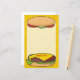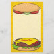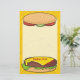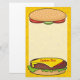 Cheeseburger cartoon illustration. Junk food outline icons yellow pattern background. Custom text.