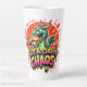 A playful dragon with horns eagerly devours a cheesy pizza slice, embodying the chaos of a fun and delicious pizza party.