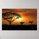 The silhouette of a cheetah chasing down a gazelle. The sunset blazes behind them.
