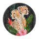 Cheetah Bouquet II by Annie Warren. Two cheetahs are framed by tropical leaves and greenery against a black background. | 164453Z