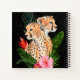 Cheetah Bouquet II by Annie Warren. Two cheetahs are framed by tropical leaves and greenery against a black background. | 164453Z