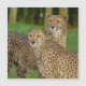 Two cheetahs stand shoulder to shoulder amidst tall trees and lush grass, their sleek bodies poised against the verdant backdrop