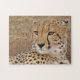 Close-up photo of a female cheetah lying in a dirt hole. This cheetah is about 18 months old, and we saw her lying in a hole in the late afternoon. While we watched, she groomed herself, then chased her tail just like a house cat does, and then settled down for a nap.