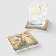 The coasters are gorgeous, a quality feel and heavy weight. They look like a precious archeological find. A rustic stone juxtaposed with a modern floral black and white print. I like the way the print goes slightly imperfect on the cut stone edges giving them a kind-of natural beauty.
