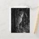 A postcard with a black and white photo of a cheetah standing in bamboo.