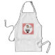 Apron with red and white chequered border and moustached chef holding steaming pizza.