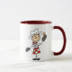 A stick figure girl chef wearing oven mitts holds a wooden spoon on our chef design T-shirts, mugs, mousepads, tote bags, cards, and other items you can customise with text or a name.