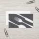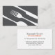 Modern, minimalistic and elegant catering, restaurant or chef business cards featuring white cutlery silhouettes (knife, fork, spoon) on a dark grey background. Customisable contact information on the back, grey and orange text. The design is contemporary with simple elegance. Ideal for a chef, private or personal chef, catering business etc.