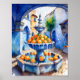 This art print features a watercolor portrait of a fountain full of oranges in Chefchaouen, Morocco.