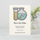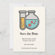 Save the date card with a cute illustration of a test tube holding yellow liquid and a rounded flask/beaker holding green liquid with red bubbles.