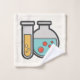 Patterned towel set with a cute illustration of a test tube holding yellow liquid and a rounded flask/beaker holding green liquid with red bubbles.