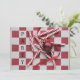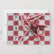 photo of peppermint sticks, a red ornament and ribbon on a red and grey stenciled chequerboard