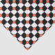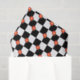 A simple, symmetrical illustration of flowers on a chessboard, in red and black colours.
