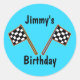 Fun birthday party sticker or envelope seal done in turquoise with black custom text. Graphics of two crossed chequered flags decorate the middle. Personalise the text for your son's special day. Great with our boys Race Car Birthday Invitations.
