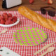Abstract digital art of lime green and pink squares in a chequered formation.