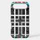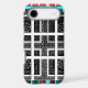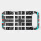 Chequered Pattern: The alternating red and cyan lines in the border, combined with the black and white squares in the centre, create a visually engaging chequered motif. The repetition and layering add to the complexity.