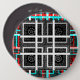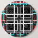 Chequered Pattern: The alternating red and cyan lines in the border, combined with the black and white squares in the centre, create a visually engaging chequered motif. The repetition and layering add to the complexity.