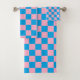 Abstract digital art of pink and turquoise squares in a chequered formation.