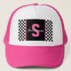 This trucker hat with Chequered Racing Stripe Design adds bold colours and graphics to your apparel. Personalise with your monogram and name.
