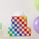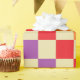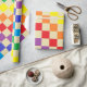 Abstract digital art of beige and rainbow coloured squares in a chequered formation.