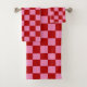 Abstract digital art of red and hot pink squares in a chequered formation. With the ability to change the pink squares by changing the background colour to match the red squares.