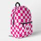 Chequered squares hot pink white geometry Monogram Printed Backpack. Cool fashion accessory bag for her. Cool retro chequered geometric square pattern. Vintage tile white and hot pink modern chequered. Create a unique and personalised backpack with a custom touch! Modern monogram with your initial and your name for that extra personal flair.