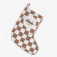 Chequered squares mocha brown white retro Monogram Christmas Stocking. Chequered squares geometric retro pattern Holiday gift. Cool retro chequered geometric square pattern. Personalise with your custom initial and name.