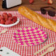 Chequered squares peach orange hot pink geometric retro pattern Paper Plates. Cool retro chequered geometric square pattern. Vintage tile pink and peach light orange modern chequered.