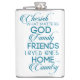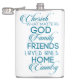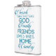 The flask itself is fine. It’s a cheap flask, obviously bought in bulk, however am prepared to overlook that. Given that it is a personalized item, I would have liked to have seen gift boxing instead of the generic packaging. Terrible printing, and/or quality. It’s a cheap, tacky vinyl. It is not cut straight and is also applied in a way that it is overhanging the bottom, causing the glue to catch on items and it will eventually roll and tear, damaging the wrap.