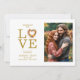 The front of the card showcases a heart-shaped floral wreath in rich autumn tones such as oranges, reds, and golds. The wreath forms the "o" in the word "love," creating a romantic and distinctive design. At the center of the wreath is a photo of the couple, adding a personalized and special touch. This design combines autumn blooms with the couple’s photo to create a visually appealing and emotional card.