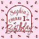 A charming cherry design to celebrate your little one's first birthday. This cherry invitation provides a hint of whimsy and vintage charm. This unique artwork has various tones of scarlet, blush, violet, and chartreuse. Change the background colour, graphic and text to fully personalise and customise.