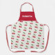 An apron with a pattern of cherries and its green leaves, and, at the bottom, a customisable text on a red background. A nice idea for a gift to a lover of sweet fruits! It could be used at work, in a garden or in a kitchen when you make artisanal jams!