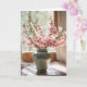 Pink cherry blossom bouquet in a vintage vase in sunlight and rustic farmhouse window background.