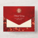 This all-in-one wedding Invitation features a traditional Chinese design with red cherry blossoms and a gold double happiness symbol on a red shimmering background. Bride and Groom names are written in an elegant classy script.